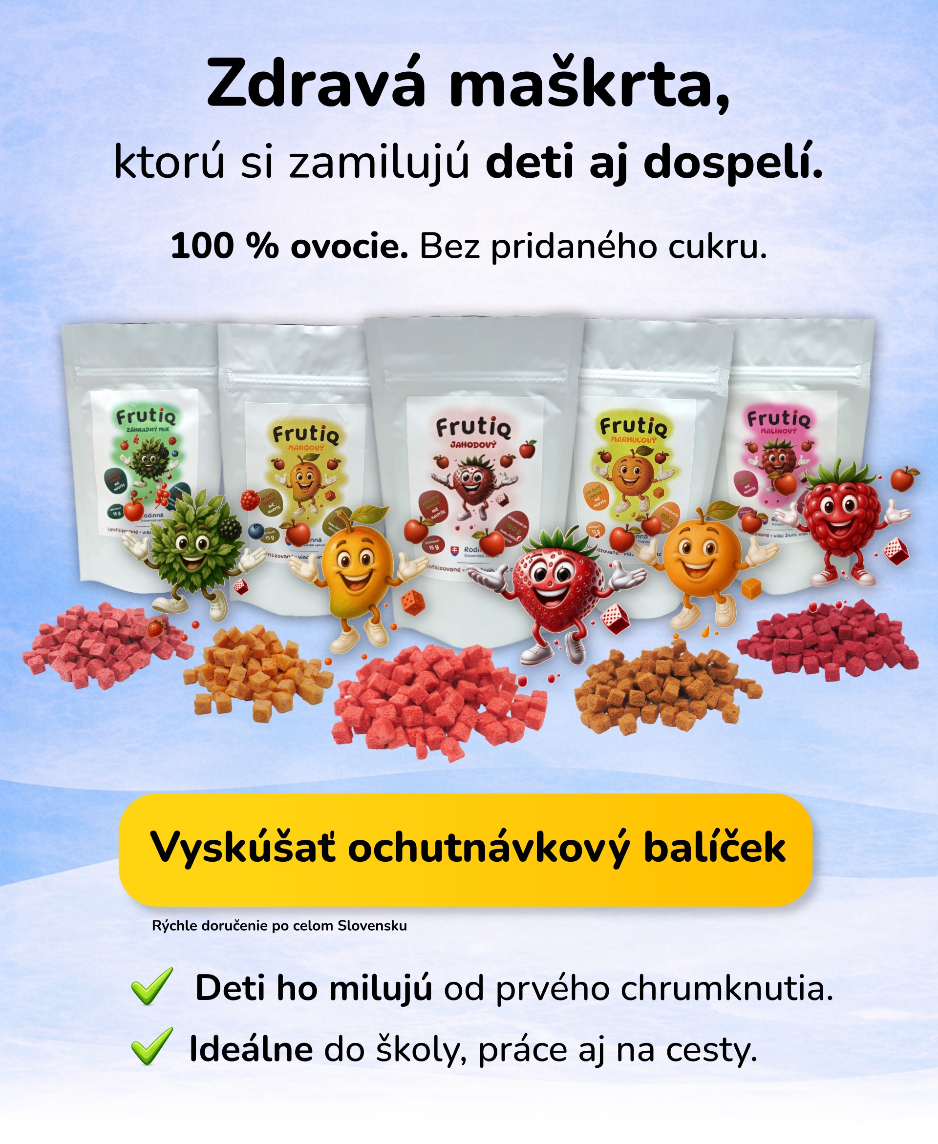Predstav si ovocie, ktoré sa nikdy nepokazí a vždy chutí ako čerstvé! Naše lyofilizované kocky sú ľahučké, chrumkavé a prirodzene sladké – bez pridaného cukru a bez akýchkoľvek iných pridaných látok. Vďaka procesu lyofilizácie (sušenia mrazom), sa v každom balení ukrýva približne 150g kvalitného ovocia plného vitamínov a vlákniny. Prírodné cukry sú skvelým zdrojom energie na športové výlety či dlhé prechádzky. A deti? Tie ich priam milujú. Miznú z balíčka rýchlejšie, než stihneš otvoriť ďalší. 🌟 [chcem vedieť viac o vás]